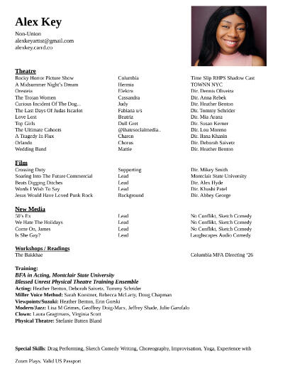 Hi there! I’m Alex (she/they) and I’m a Brooklyn based actor, mover, and writer.In my free time you can catch me obsessing over the latest horror movie (currently Weapons) or crying over a romance novel (currently Happy Place by Emily Henry)!Aside from acting I am also an editor! Whether it’s a dramatic play or a short comedic skit, I offer stellar proofreading and editing services along with constructive criticism if needed!I also have experience with social media marketing and content creation especially with apps like Instagram and TikTok.If you want to promote your passion project and see all your hard work come to life, I’m the gal to help you do it.
